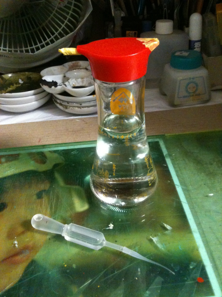 絵皿に固まった塗料を効率良く溶かすのに、ほんの少しだけ溶媒液があると都合がいい事が最近分かりました。